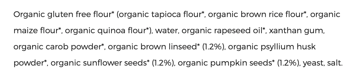 Gluten free flour* (tapioca flour*, brown rice*, potato starch*, maize meal*, quinoa flour*), sunflower oil*, psyllium husk*, linseed* (1.4%), sunflower seed* (1.4%), pumpkin seed* (1.4%), yeast, carob*, sea salt, thickener (xanthan gum). * = produced to organic standards. For allergens, including cereals containing gluten, see ingredients in bold.